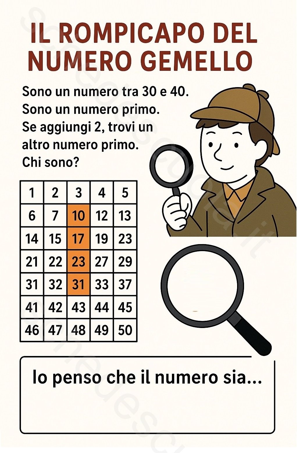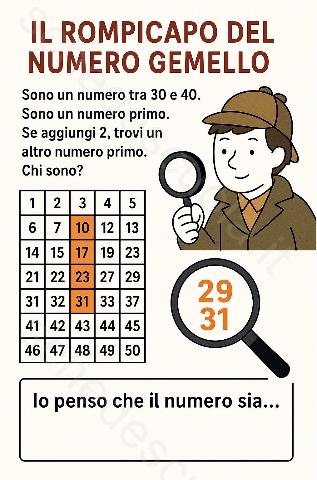> “Sono un numero tra 30 e 40. > Sono un numero primo. > Se aggiungi 2, ottieni un altro numero primo. > Chi sono?”