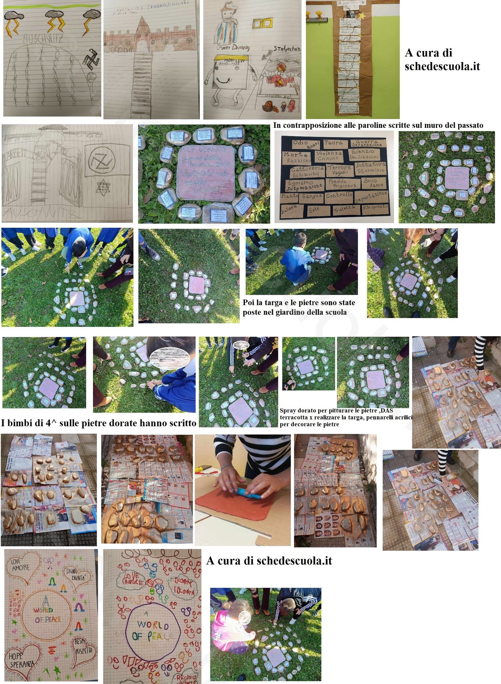 Gli alunni di quarta hanno invece dedicato le loro pietre a un messaggio di speranza. Hanno decorato ciascuna pietra dorata con parole simboliche che rappresentano i valori positivi che costruiscono un futuro migliore. Tra queste parole: