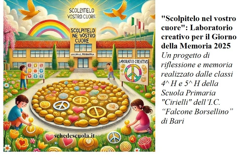 In occasione del 27 Gennaio, Giorno della Memoria 2025, i bambini delle classi 4^ H e 5^ H della Scuola Primaria “Cirielli” hanno preso parte a un laboratorio creativo intitolato “Scolpitelo nel vostro cuore”, guidati dalle insegnanti delle rispettive classi. L’attività ha rappresentato un viaggio nella storia, nella memoria e nei valori universali di pace e umanità.